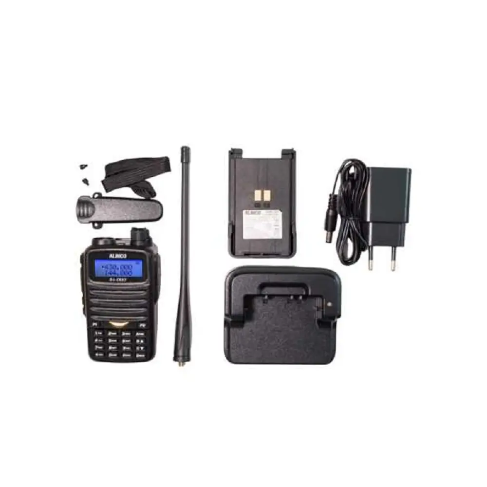 HT dual band Alinco DJ-CRX7 dengan frekuensi VHF 136-174 MHz; UHF 400-438 MHz, power output 5W (VHF), 4W (UHF), 200 channel memori.